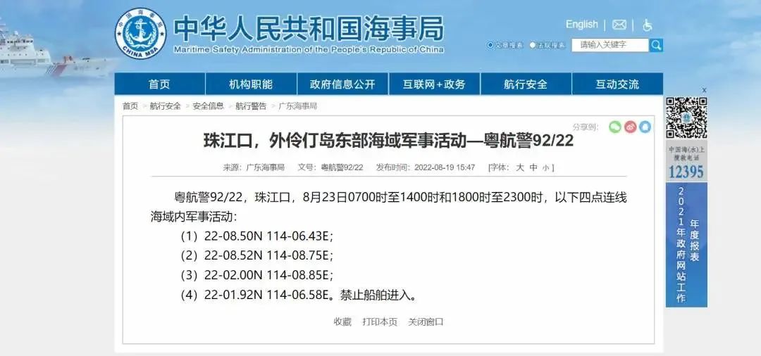 珠江口,外伶仃岛东部海域军事活动—粤航警92/22