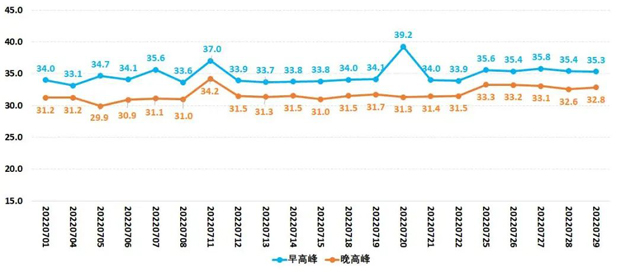 2022年7月份工作日,南海区高峰期平均速度为33.3km/h,环比上升1.8%。高峰期平均速度稍有上升。本月早高峰平均速度为34.8km/h,晚高峰平均速度为31.8km/h。