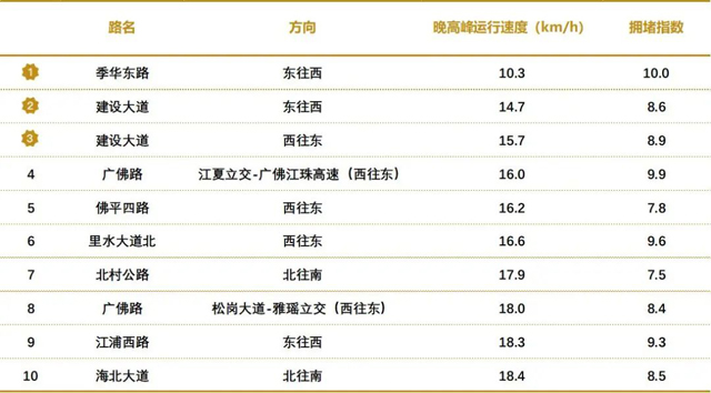 2022年7月份工作日晚高峰,季华东路东往西方向运行速度仅为10.3km/h,道路拥堵指数达到10.0。其余拥堵道路详见下表: