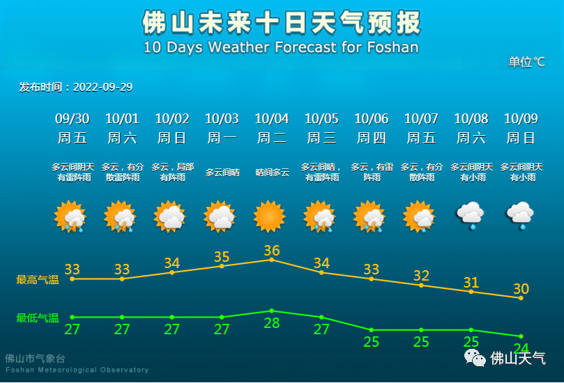 10月1日:多云,有分散雷阵雨,27~33℃;