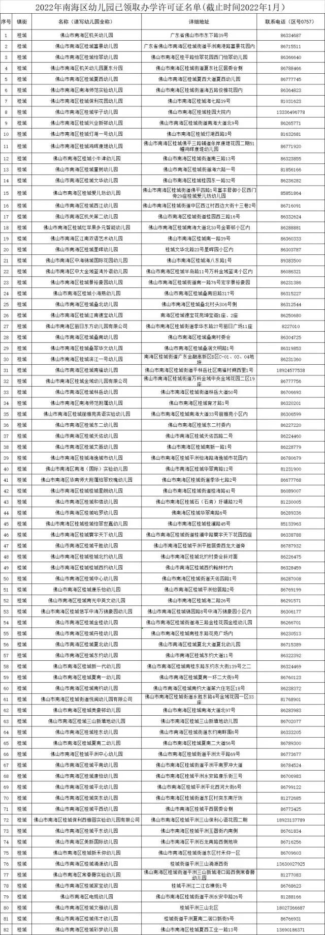 近日,南海区教育局公布了《2022年南海区幼儿园已领取办学许可证名单》,截至今年1月,南海区已领取办学许可证的幼儿园共416所,其中桂城街道共有82所。