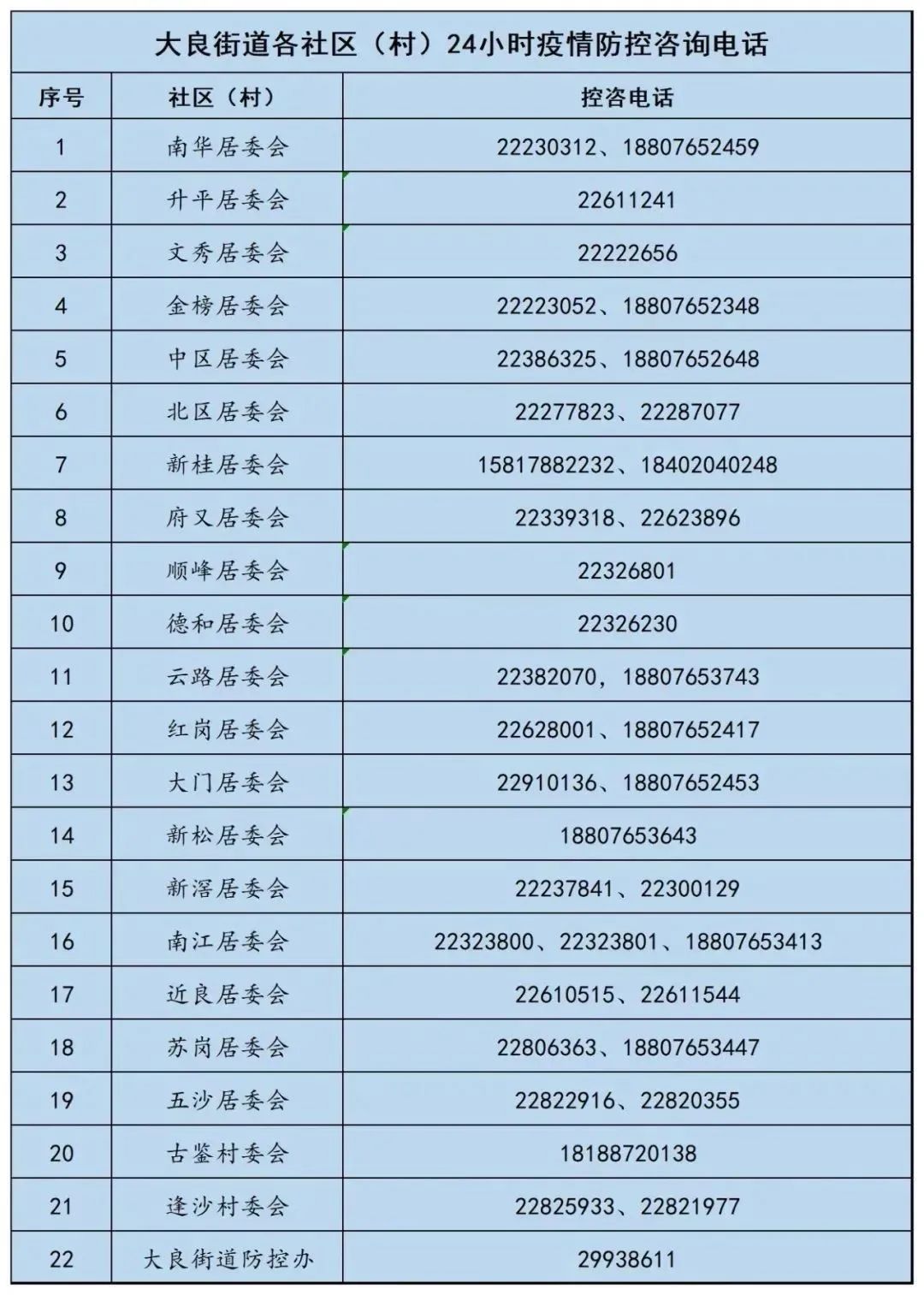 2022年10月29日:旧圩社区、锦龙社区、合成社区、永兴社区、绀现村、大都村、仙涌村、美的花湾城、花卉世界,详见下表。