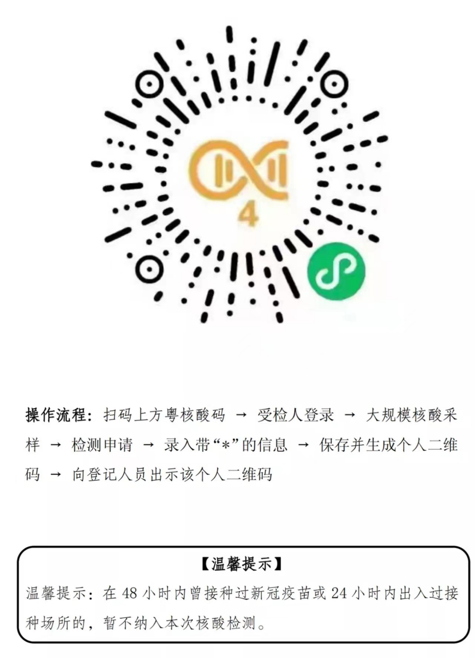 2、请携带手机,提前准备好“粤核酸4”小程序采样码。老人、未成年人等没有智能手机或不方便使用智能手机的,可在家人手机账号下添加生成其二维码。