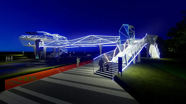 以“水晶”作为设计原型,通过钢化玻璃的整体运用,化解天桥钢结构所造成过于工业化的视觉感官。建成后,夜晚的人行天桥,在灯饰的营造下,霓虹闪烁,将显得更加璀璨,远远望去,犹如一颗砖石镶在东平河畔。