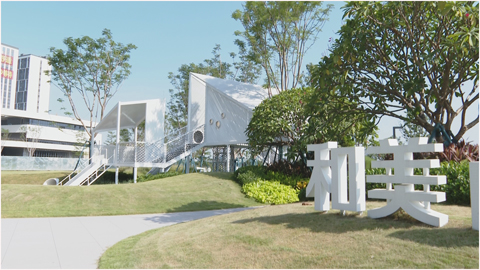 和美公园位于即将开通的美的大道旁,公园最大的亮点是入口处这座纯白色大型游乐设施,占据了公园四分之一的面积,不同于其他公园色彩斑斓的儿童游乐设施,这座大型欢乐堡垒设计简约时尚,主体纯白搭配了黑色网格绳爬梯,被周边众多绿植围绕,一棵绿树穿插其中,小朋友在这里游玩就像身处童话故事中的“树屋”一样。