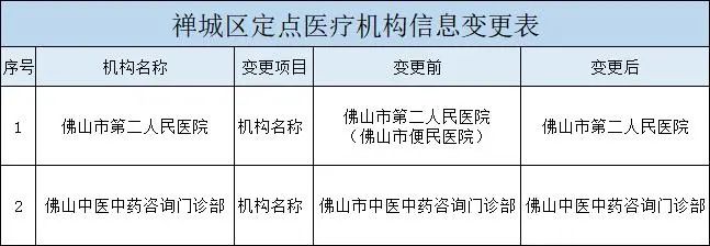 根据《佛山市医疗机构医疗保障定点管理实施办法》(佛医保〔2021〕93 号)的有关规定,佛山市第二人民医院(便民医院)和佛山市中医中药咨询门诊部向我局提交变更医疗机构名称申请,“佛山市第二人民医院(佛山市便民医院)”变更为“佛山市第二人民医院”,“佛山市中医中药咨询门诊部”变更为“佛山中医中药咨询门诊部”。经我局审查,同意变更名称后的“佛山市第二人民医院”和“佛山中医中药咨询门诊部”继续作为佛山市医疗保险和生育保险定点医疗机构,医保类别维持不变。
