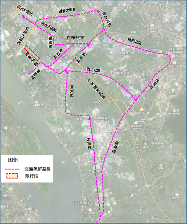 路径2:限行段西侧地区→创业大道南→轻纺路→百西环村路→百太路→西江公路→限行段南侧地区。