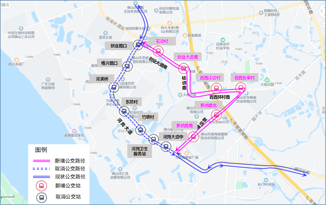 双方向取消停靠站点:河岗卫生服务站、竹塘村、东坊村、西樵河岗临时总站;