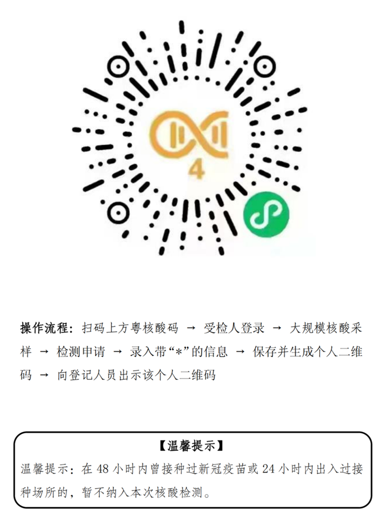 (三)请携带手机,提前准备好“粤核酸4”小程序采样码。老人、未成年人等没有智能手机或不方便使用智能手机的,可在家人手机账号下添加生成其二维码。