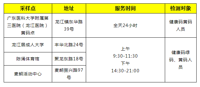 注意事项:48小时内接种新冠疫苗的暂不进行检测,待接种满48小时后再进行检测;粤康码黄码人员请前往上述黄码点进行检测;居家隔离或居家健康管理人员由所在村(社区)“三人小组”上门采样;粤康码红码人员请迅速联系所在村(社区)报备。