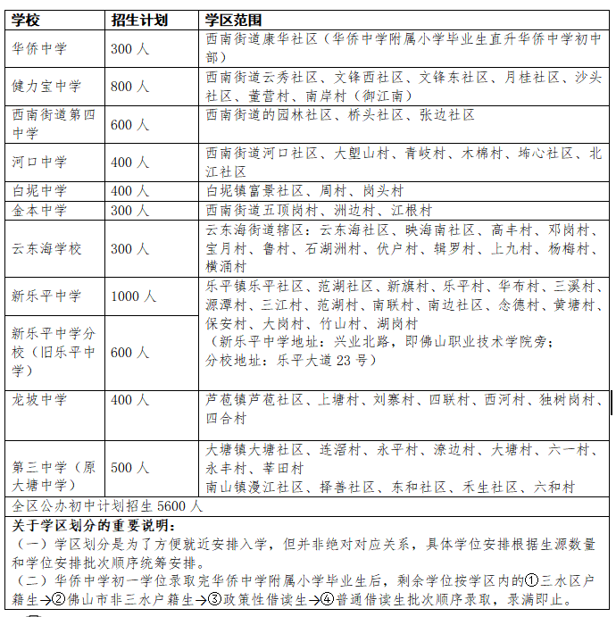 佛山三水区公办初中秋季学期初一年级 招生工作方案