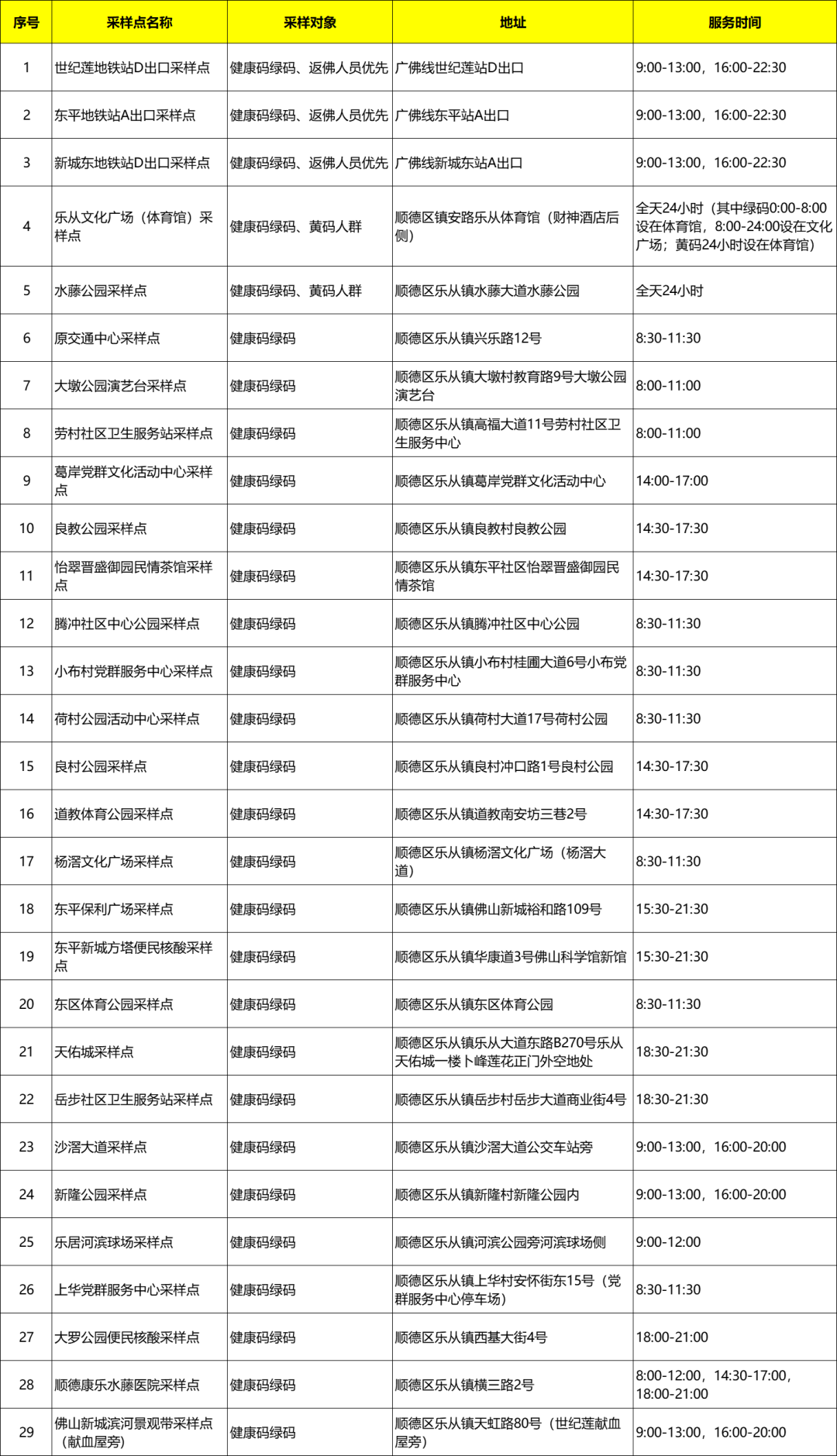 五、此外,11月30日乐从镇以下便民核酸采样点也对外开放。目前,乐从镇各便民核酸采样点均不收费(具体结束时间另行通知),提供混检免费采样服务。
