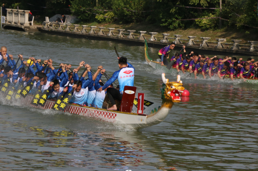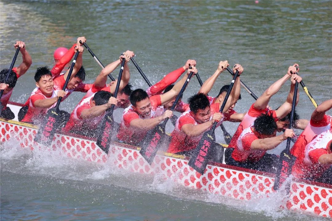 河中鼓点声声,运动员随着鼓点、喊着号子,挥动船桨,铆足劲、齐发力,划向终点。