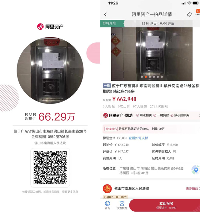 位于广东省佛山市南海区狮山镇长岗南路26号金棕榈园10栋2座706房。建筑面积:88.51㎡。登记日期:2018年2月12日。用途:住宅。起拍价:66.29万元。