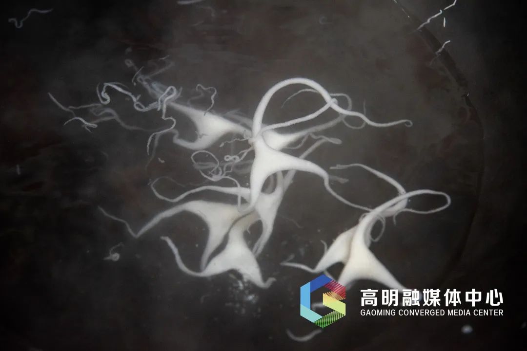 水菱角的形状是否饱满主要看制作者的筷子功,这一步非常讲究手指的灵活和巧劲,手法必须稳、准、狠。用筷子挑起事前和好的米浆,轻轻张开筷子把面糊摊开,让其从一条线变成一个三角形,筷子前端张开令面糊的两个角延展,面糊脱离筷子时还会拖出细长的须,像是小燕子般飞入热水锅中。在烧开的热水中,短短几秒时间,白如雪一般的水菱角便已成型,浮在水面。
