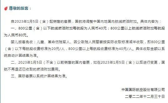 另据媒体报道,12月30日,机票代理平台接到多家国内航司消息:自2023年1月5日(出票日期)起,调整国内航班燃油附加费征收标准,800公里及以下航段成人旅客的燃油附加费降至40元,800公里以上航段降至80元。