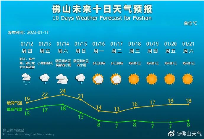 @广东天气 预计,1月11-14日,广东维持阴雨有雾天气,其中韶关、清远、珠江三角洲北部市县、粤西部分市县有大雨局部暴雨;昼夜温差小;广东大部市县和海面的雾渐趋明显;雨雾时部分市县和海面能见度低于1公里;气温缓慢回升。1月14日,北方一股强冷空气前锋将率先影响粤西北地区,夜间开始自北向南影响广东,给广东带来一次持续降温、海面大风、低温冰霜冻和降水的天气过程。
