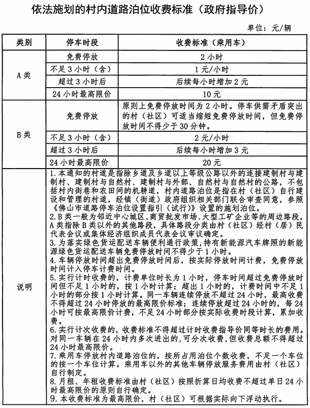 (三)基于上述依据,价格主管部门制定了依法施划的村道泊位停车收费政府指导价。《佛山市南海区发展和改革局 佛山市南海区市场监督管理局关于进一步规范村(社区)机动车停放服务收费的通知》也专门在文件中明确,村(社区)停车设施定价区分为“村道泊位”和“其他停车设施”,分别实施政府指导价和市场调节价。