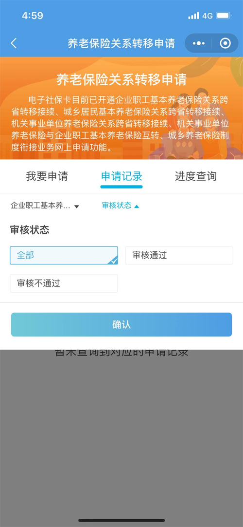 选择需要转移的选项点击“去申请”,在*栏输入相关资料。参保人可以在“申请记录”和“进度查询”查询该笔转移业务的进度详情。