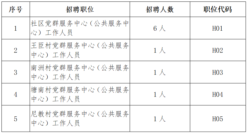 本次公开招聘村(社区)党群服务中心(公共服务中心)工作人员10名,具体招聘职位如下: