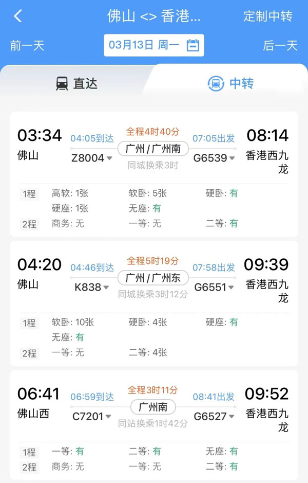 包括直达和中转方案,目前有21趟列车可从狮山前往香港,各位街坊可通过铁路12306网站或手机APP购票。