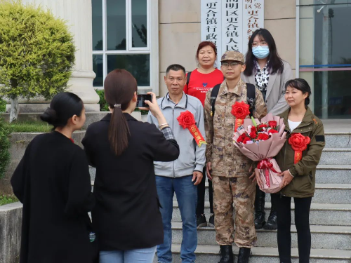 会后,更合镇领导班子在镇政府大楼前为入伍新战士佩戴绶带、发放入伍纪念品,并为新兵们送行。少先队员向入伍新战士献鲜花。