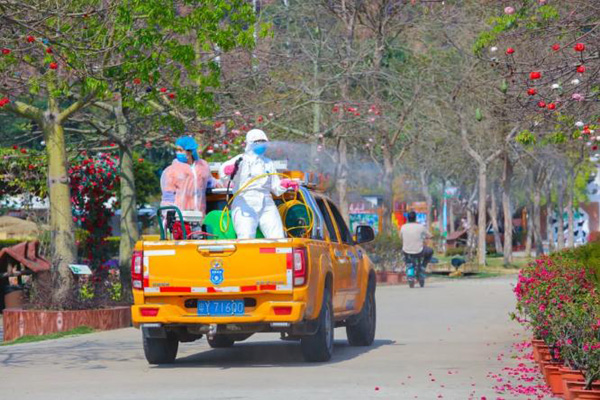 复业之际,景区严格落实疫情防控措施,对园区内外环境采取全方位消毒,对娱乐设备进行安全检测、给员工开展安全培训。