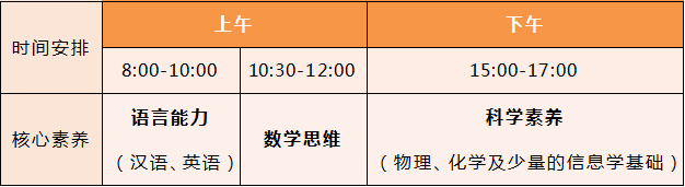 范围:初中阶段语文、数学、英语、物理、化学五个学科内容,侧重评价初中阶段各学科主干知识和学科核心素养及其创新潜质。自主招生综合评价总分为490分,学科占比为:语文素养约25%,数学思维约30 %,外语能力约20%,科学素质约25%(物理与化学占比分配为7:3)