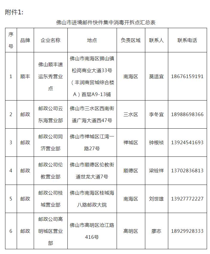 附件:1.佛山市进境邮件快件集中消毒开拆点汇总表