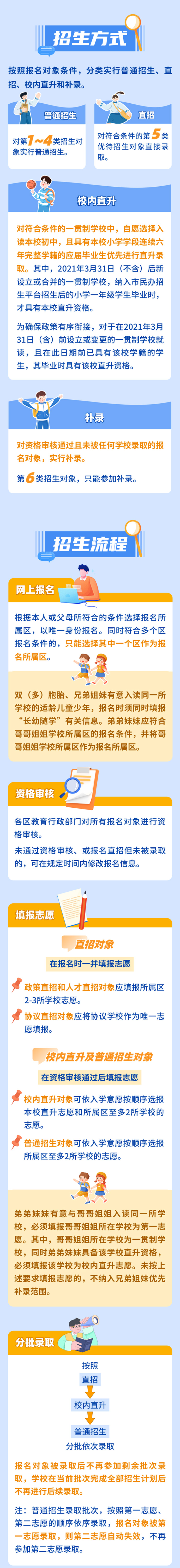 兄弟姐妹方面,统一注册后,在不超招生计划的前提下,学校必须优先补录符合条件的兄弟姐妹,市民办招生平台自动为符合条件且未被任何学校录取的弟弟妹妹补录至哥哥姐姐所在学校;补录人数超过剩余招生计划的,由各区教育行政部门确定具体补录办法。