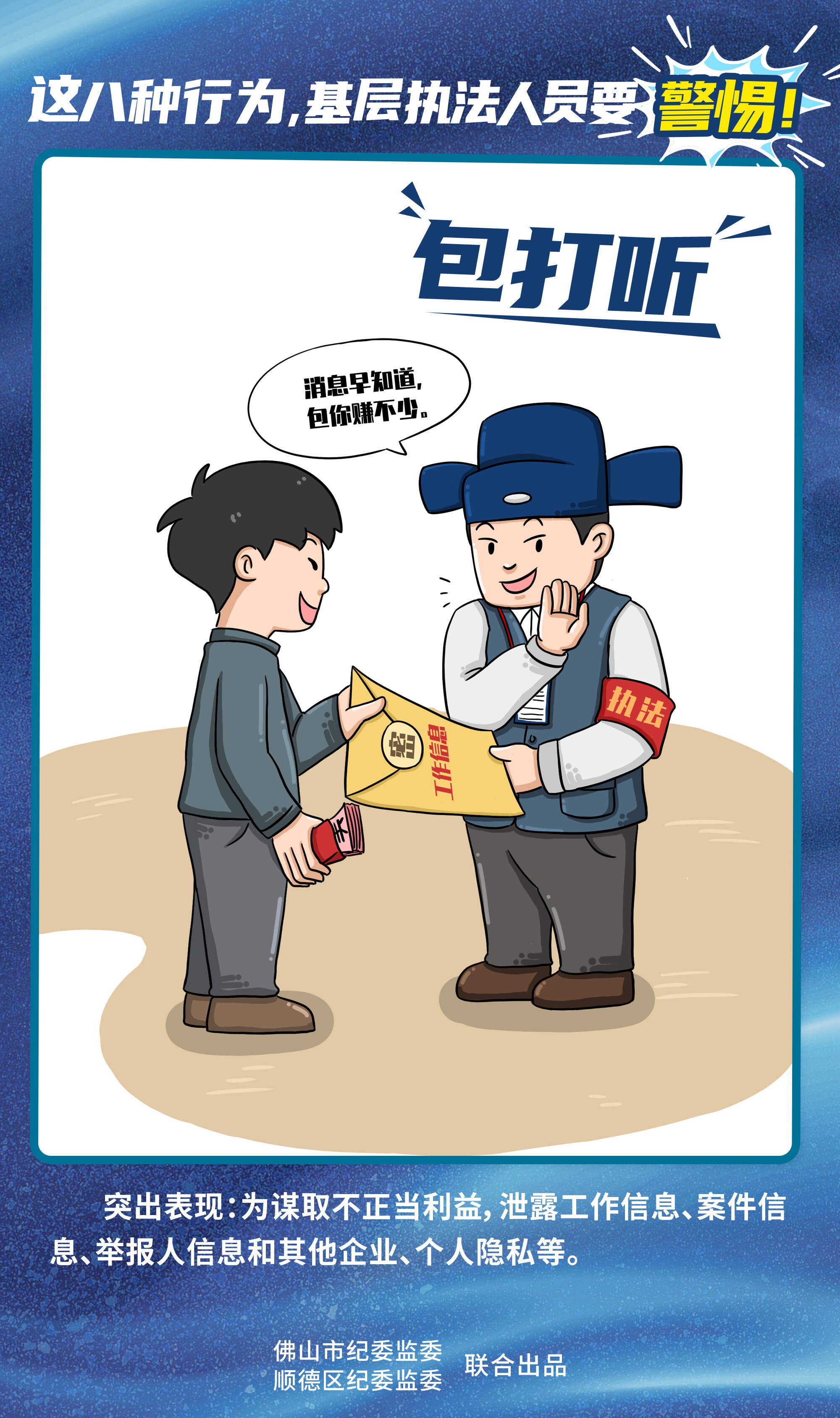 十九届中央纪委四次全会强调,要深入开展民生领域损害群众利益问题集中整治。近日,为推动落实“六稳”“六保”,佛山市、顺德区纪委监委先后对基层执法领域侵害企业和群众利益突出问题专项整治工作进行了部署。针对此次重点整治的不作为、慢作为、乱作为和以权谋私等侵害企业和群众利益的八大类问题,顺德区纪委监委牵头制作了专题漫画,提醒各位基层执法人员举一反三,引以为戒,积极主动为广大企业特别是民营企业健康发展保驾护航,为确保社会大局稳定提供坚强保障。