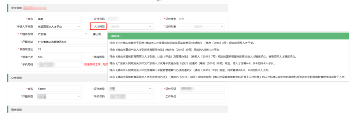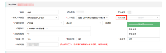 如果以“市、区高层次人才子女”或“教育优待对象子女”作为申请入学类型,经审核不符合“市、区高层次人才子女”或“教育优待对象子女”条件的,如果学生是佛山市户籍的,系统会自动判断学生的户籍生类型,以对应户籍生身份参加摇号。