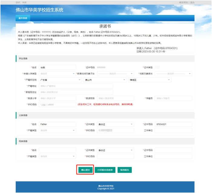 进入信息填报前请认真阅读《承诺书》。初中招收接受完规定年限小学教育且不具有初中学籍的学生。(一经发现不符合上述条件的,直接取消佛山市华英学校录取资格。由此造成的一切后果由家长负责。)