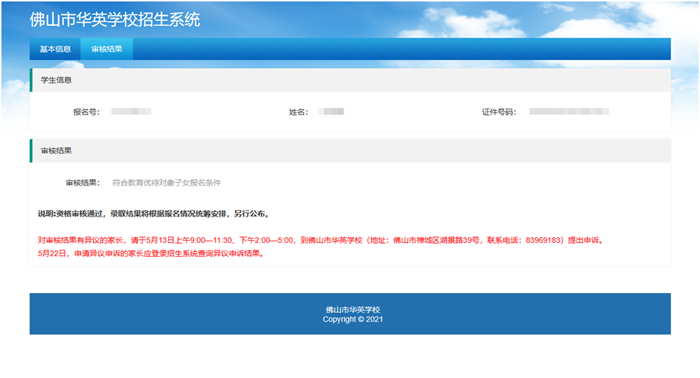 5月10日至5月12日,家长登录“佛山市华英学校招生系统”(网址:https://cczs.fsccjy.com/huaying/)查询审核结果。