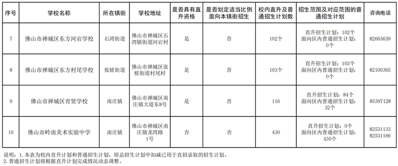 禅城区2023年民办初中校内直升及普通招生计划