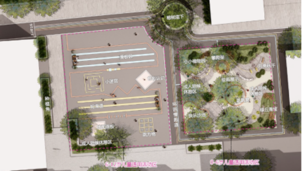 儿童活动场地。社区户外儿童游戏空间和设施可与社区公园、小区游园、附属绿地、居民健身场所等室外公共设施结合设置。根据不同年龄段儿童的身心特点分区设置游戏区域和设施,并保证成人看护区与儿童游戏区之间的视线通畅,增强安全感。