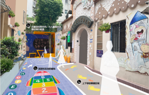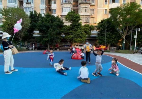 海珠区南华西街道海天社区,利用三面住宅围合空间,通过场地塑造、游戏设施完善、IP形象植入以及儿童偏好色彩标识,构建有围合感、安全感、活力、多元的儿童活动空间。家长可在家观察儿童活动的情况,增强了家长与儿童的安全感。同时引导儿童与看护人群通过活动交流增强亲子关系,打造全年龄共融的社区交往场景。