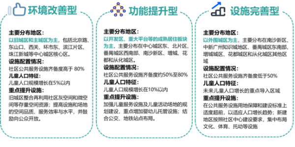 遵循广州特色的社区空间指引。《规划指引》充分结合广州地域特色,构建系统性规划体系和在地化建设指引,结合广州的空间特征和儿童人口分布特征,分类指引社区设施及空间建设,结合设施配置情况、地区儿童人口增长趋势、不同城区社区尺度规模,将社区设施和空间建设划分为环境改善型、功能提升型、设施完善型三类,提出差异化的社区优化重点提升策略。
