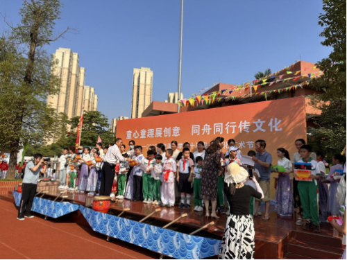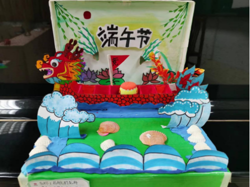 操场上各类龙舟主题节目活动精彩纷呈,包括歌唱、舞蹈、龙舟操以及旱地龙舟赛等特色项目。学生和家长一起参与,沉浸在一片喜悦中。校园里精心布置了龙舟摊位,摊位上展示了学生们利用垃圾废品制作的龙舟模型,此外还有龙舟手抄报、书签、扇子等作品。