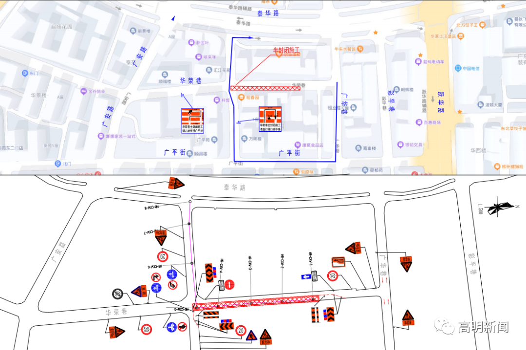在华荣巷施工工期为60天,施工期间,各位市民可以往广平街→广安路→泰华路进行绕行,华荣巷附近的市民可以华荣巷→广安路→泰华路进行绕行。