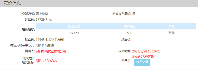 8月28日,保利以总价57729万元,斩获桂城平洲深涌占地逾1.7万㎡靓地,折合楼面价约12943元/㎡。