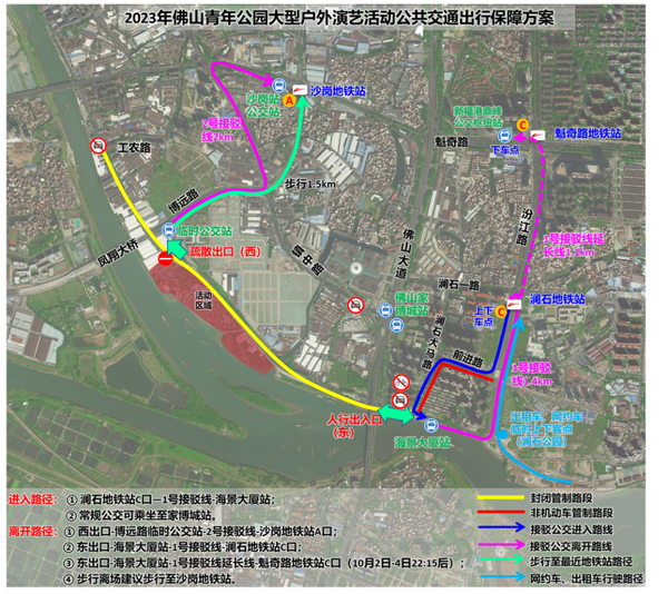 由于活动区域设置东出口(佛山大道方向)和西出口(凤翔大桥方向)两个出口,市民可自行选择以下路径离场。
