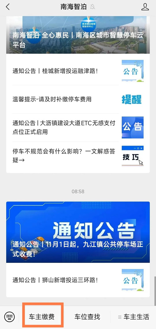 (1)打开“南海智泊”微信公众号,点击“车主缴费”。
