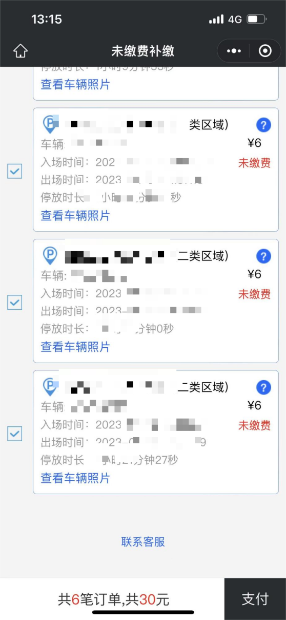 (3)选择需要补缴费用的停车订单,完成缴费。