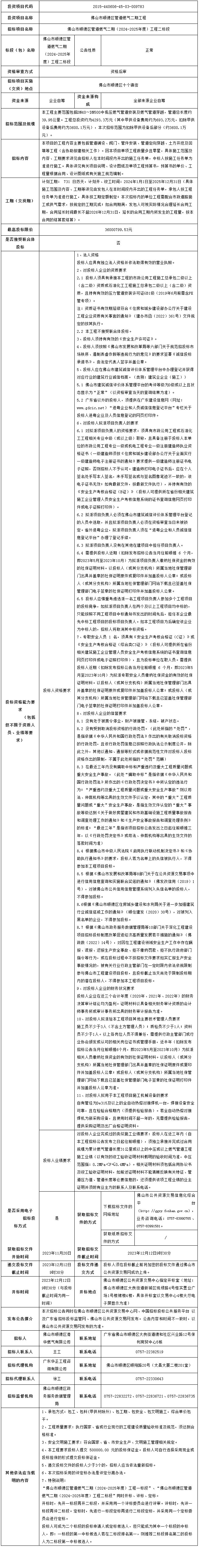 佛山市顺德区管道燃气二期(2024-2025年度)工程二标段招标公告