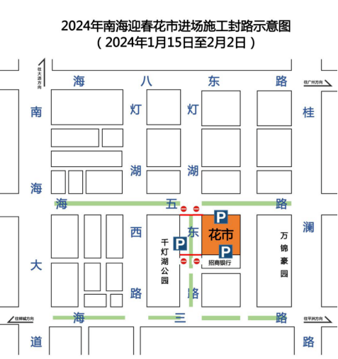 2024年南海迎春花市将于灯湖东路(海四路至海五路)及富力广场举办,由于涉及牌楼搭建和场地布置等工作,为使工作有序开展,届时将对相关路段实施交通管制。