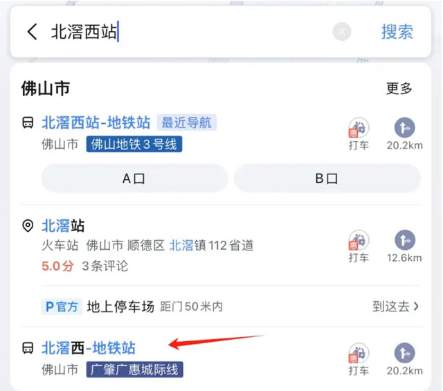 乘客可在地铁北滘西站A、B口出站换乘前往城际北滘西站B1、B2口。