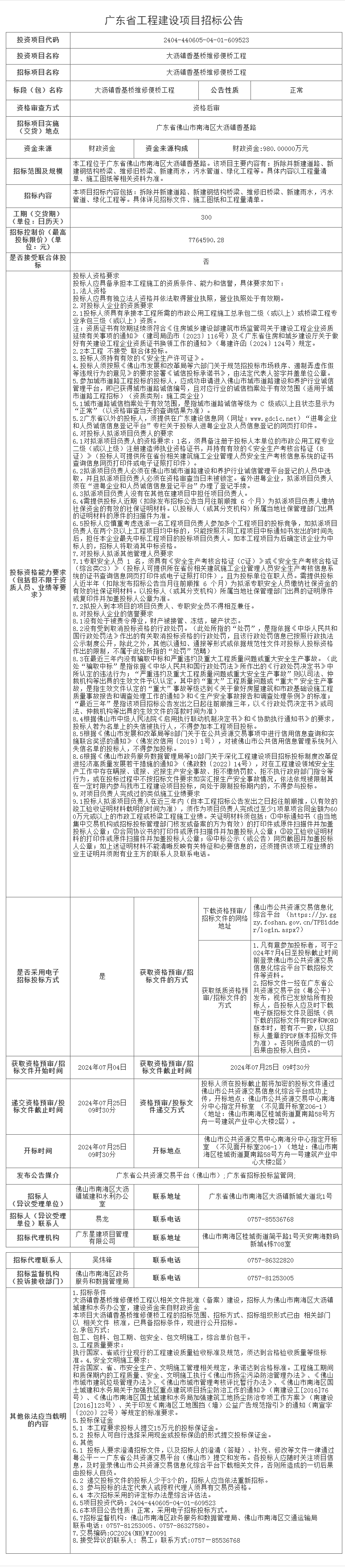 南海大沥镇香基桥维修便桥工程招标公告
