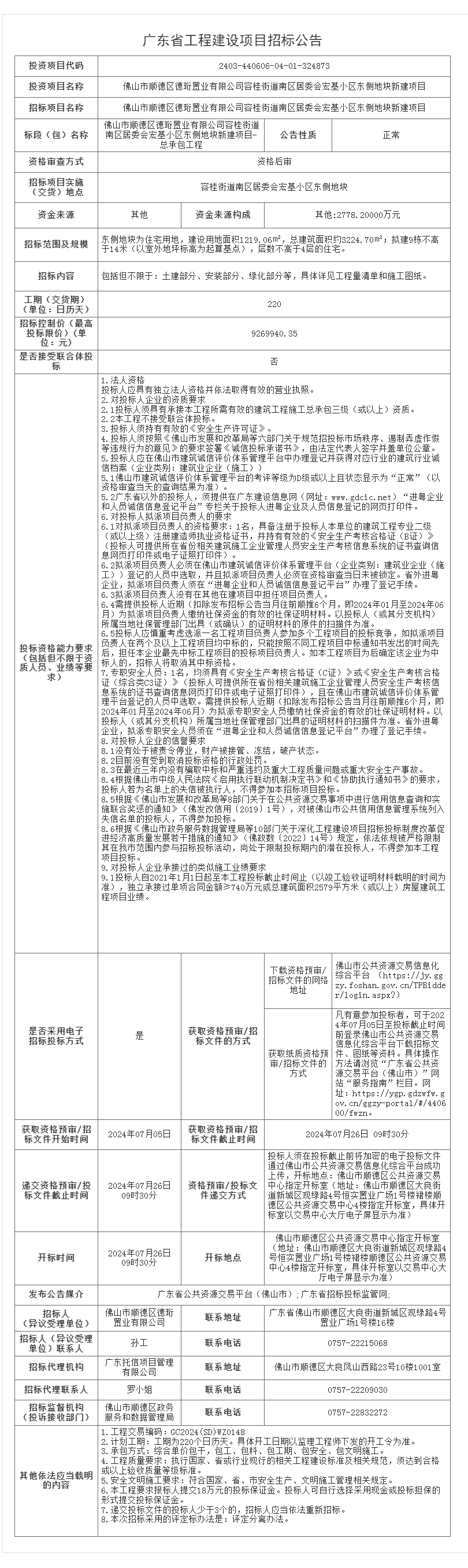 顺德大良街道碧桂路以东、南国东路以南地块项目二期施工总承包工程招标公告