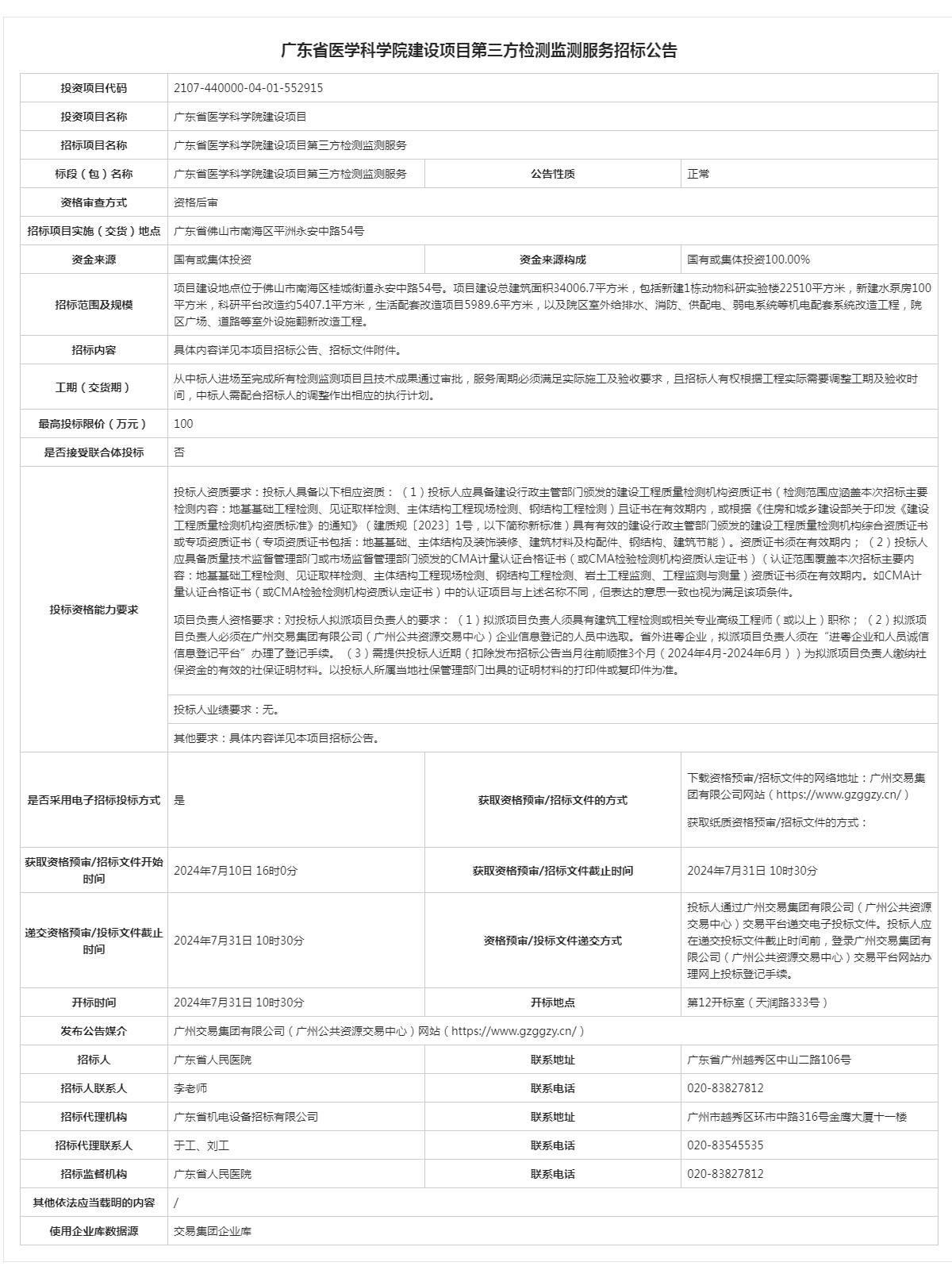 广东省医学科学院建设项目第三方检测监测服务招标公告